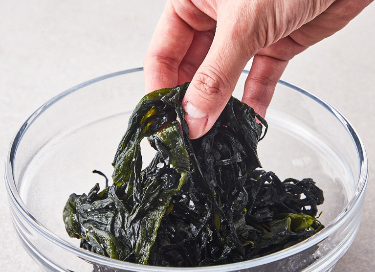 - 건미역을 찬물에 10~15분 정도 불린 후 깨끗이 씻어 물기를 제거하고 먹기 좋은 크기로 자릅니다.