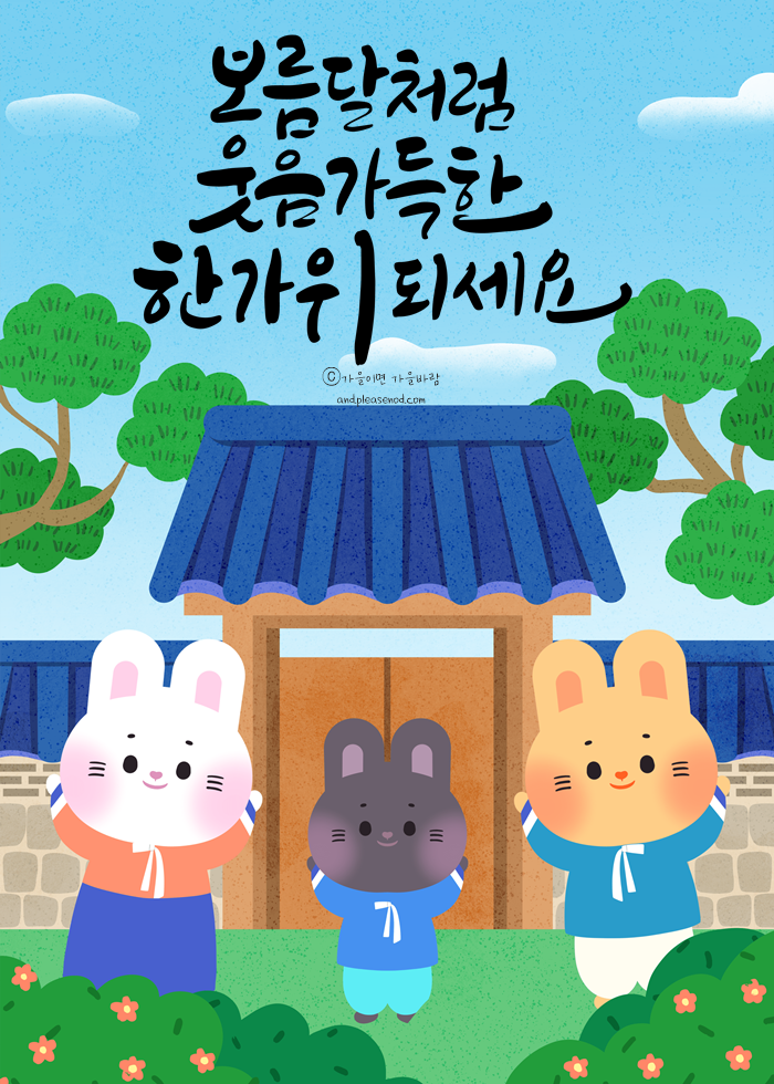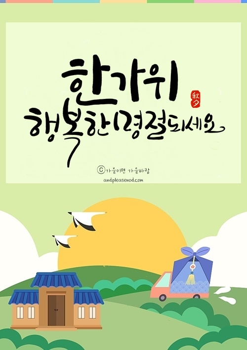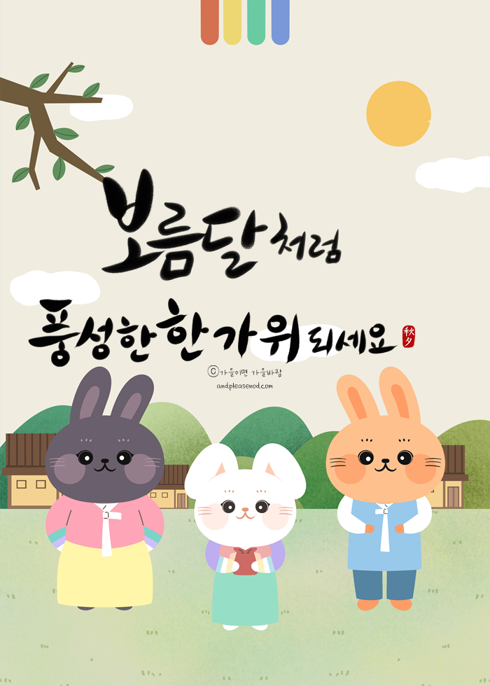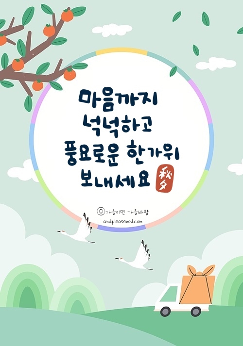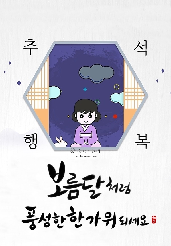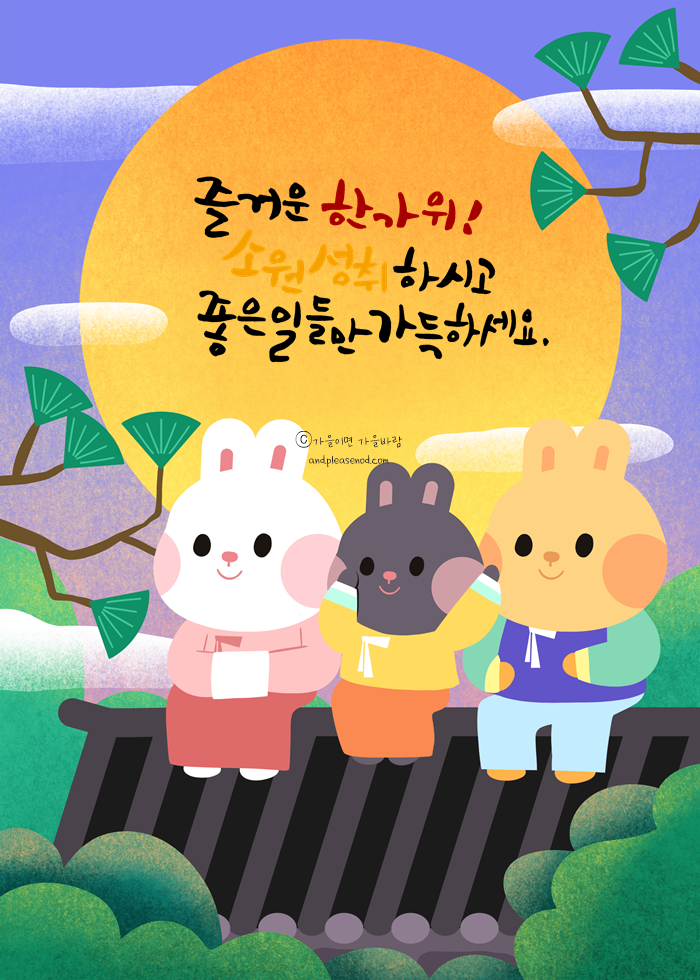 -이번 추석엔 보름달이 여러분께 "소원 다 들어줄게!"라고 속삭일 거예요. 가족들과 함께 웃음 가득한 시간 보내시고요. 고향 가는 길은 조금 막혀도 마음만큼은 시원하게! 풍성한 음식과 함께 가족의 정도 가득 채워가는 연휴 , 건강과 웃음이 넘치는 명절 보내세요.