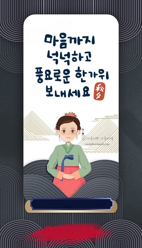 -넉넉한 가을처럼 여러분의 삶도 풍요로 가득하시길 바랍니다. 추석 명절, 소중한 분들과 따뜻한 시간을 보내세요. 가족들과 함께 나누는 웃음이 행복으로 이어지기를 바랍니다. 건강과 기쁨이 함께하는 연휴 되세요.