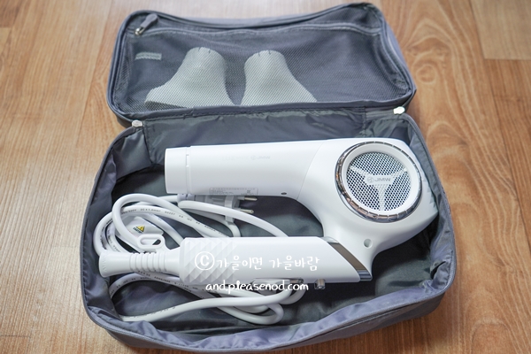 제가 구매할 때는 여행용 파우치와 파워노즐 2종을 받았는데 현재는 독일제 감자채칼도 사은품으로 제공되고 있더군요. 여행용 파우치로 온 가방의 색깔은 회색이었고 탄탄하게 만들어졌습니다. 여행갈 때 드라이기를 보관할 수 있고 드라이기를 가져가지 않을 때는 속옷이나 양말을 보관해도 좋을 것 같습니다.